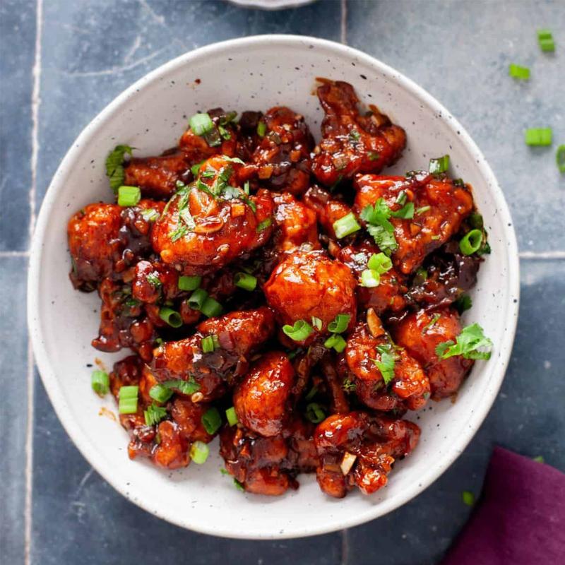 Crispy cauliflower florets tossed in a tangy garlic-soy sauce with Indo-Chinese spices, served hot and crunchy.